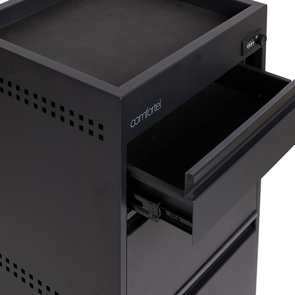 Para los amantes de las líneas limpias, minimalistas y elegantes. Diseñado por el equipo de Comfortel, este carro de peluquería en acabado metálico negro mate dispone de 4 amplios cajones con cerradura de combinación. Este carro metálico con recubrimiento en polvo viene con una amplia bandeja superior, una alfombrilla extraíble resistente al calor y las características ruedas repelentes de pelo de Comfortel.